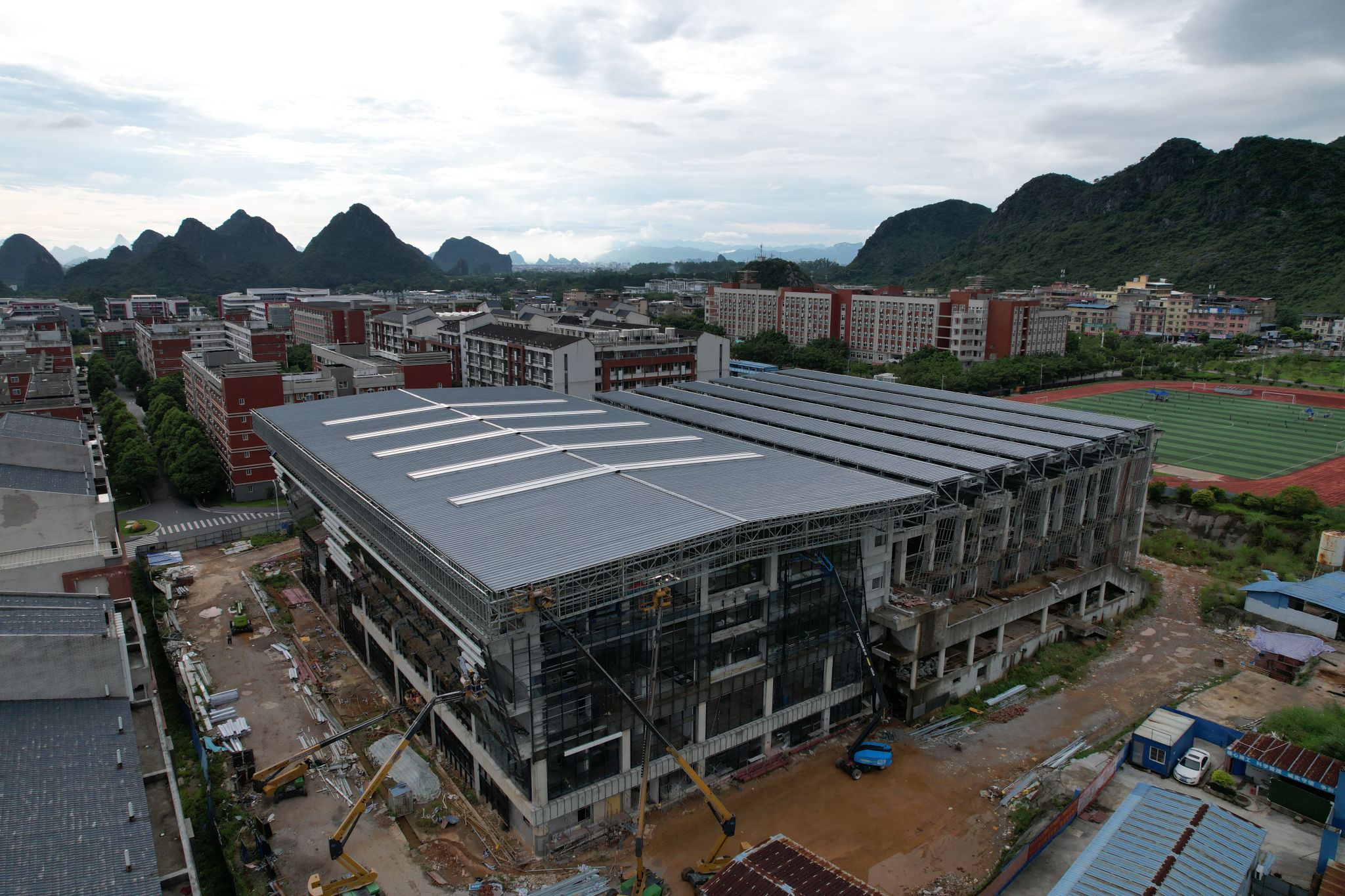新校区扩建项目综合体育馆工程2025年7月份形象进度:正在进行幕墙安装、一体化板龙骨施工、栏杆扶手安装、云浮式吸音体吊顶安装、装饰线条安装。