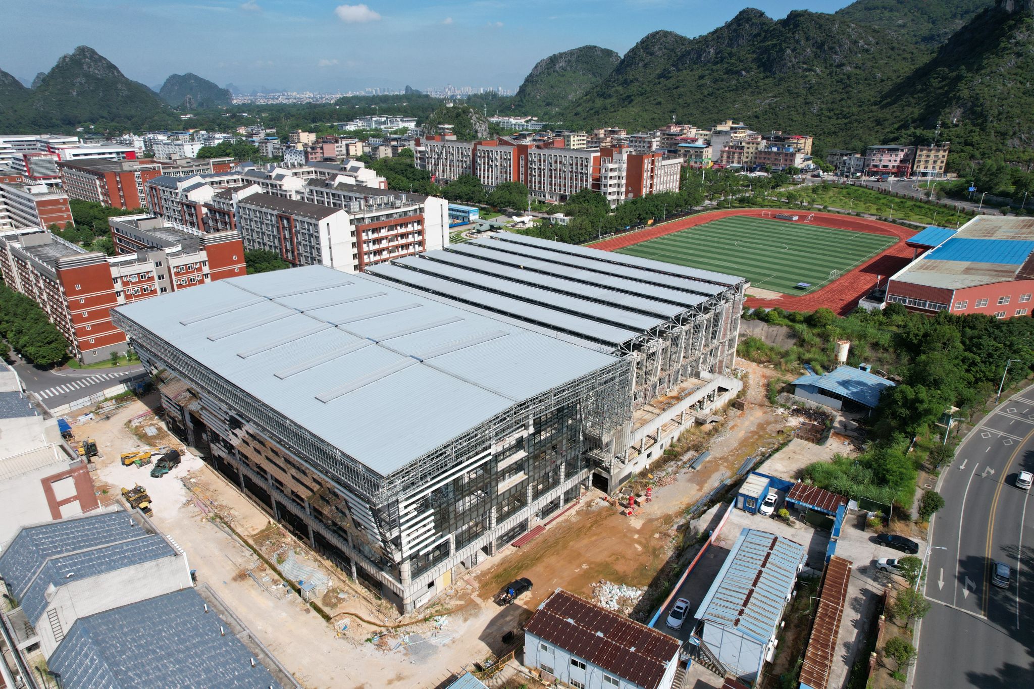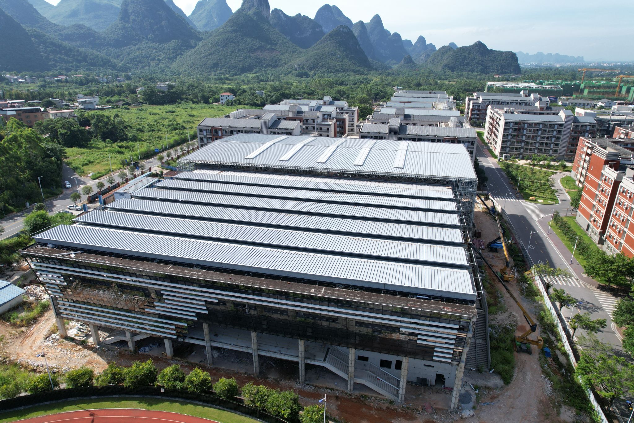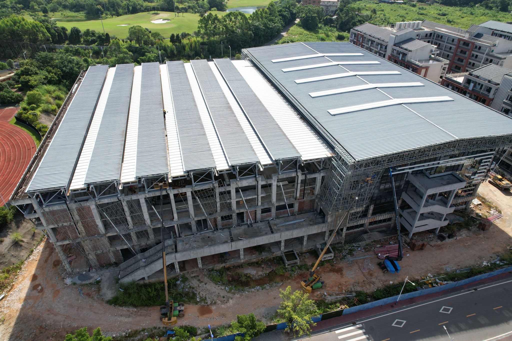 新校区扩建项目综合体育馆工程2025年8月份形象进度:外墙一体化板龙骨施工完成90%;不锈钢室内栏杆施工完成;A区1、2层消防管安装完成;消防水泵房主机安装完成;消防强排风管安装完成90%;包梁、包柱施工完成50%;水电工程排水管安装完成80%;浮云吊顶A区2层安装完成;外墙铝单板线条安装完成70%。